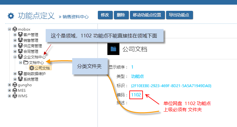 Mobox文檔中心定義 – 1101 及 1102 功能點 注意 2023/09/13 分類:產(chǎn)品中心 實施方案 750 mobox文檔中心可以掛接 1、單位網(wǎng)盤? ? ? ?(1102 功能點) 2、部門網(wǎng)盤? ? ? ?(1102 功能點) 在設置的Mobox文檔中心的時候,功能點不能直接掛到領域下面,而必須在領域下面先建立分類文件夾,之后才能掛接這2個功能點。 若直接掛到領域下面,會出現(xiàn) 而需要改成下圖發(fā)設置方法 標簽:方案 上一篇: 低代碼平臺關于數(shù)據(jù)對象定版后權(quán)限控制 下一篇: 關于Gungho及Mobox的授權(quán)(臨時授權(quán)部分)