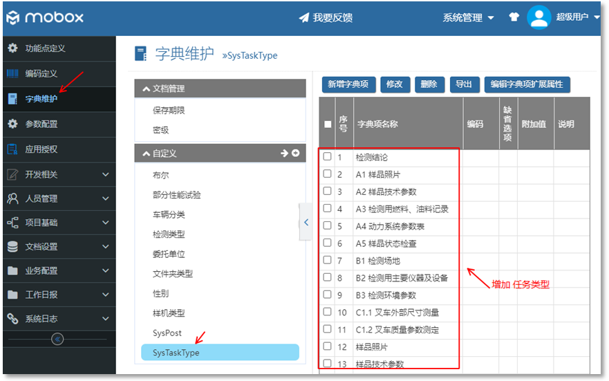 • 字典里面增加:SysTaskType,里面定義任務類型的名稱