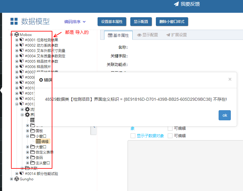 Mobox2數據模型導入后-小窗口或grid點擊報錯(不存在) 2024/02/29 分類:產品中心 問題中心 655 mobox2數據模型導入后 (導入后 提示成功,并沒有提示錯誤) 若點擊模型對象的小窗口,或grid 系統提示錯誤 如 小窗口點擊后報錯 或 grid 點擊后報錯 解決方法 將數據對象重新導入一次 導入后,再次提示 成功 ,如 之后,再點擊前面出錯的小窗口或grid 就正常了 標簽:問題 上一篇: Gungho項目管理系統界面自定義配置 下一篇: Gungho項目擴展屬性二次開發的實現過程