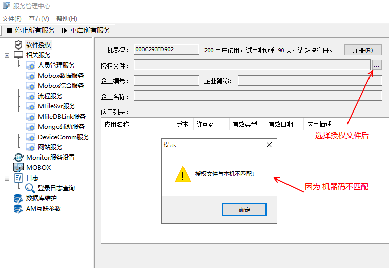 mobox系統(tǒng)部署后,我們需要得到當(dāng)前機(jī)器的機(jī)器碼及甲方單位全稱,到公司申請(qǐng)授權(quán)文件。得到授權(quán)后進(jìn)行注冊(cè),mobox軟件才能正常使用。下文重點(diǎn)介紹在這個(gè)過程中關(guān)鍵點(diǎn)及可能遇到的問題。