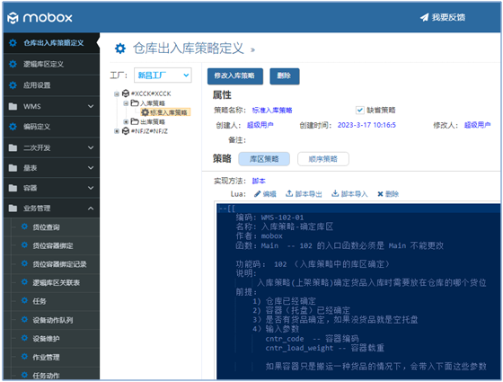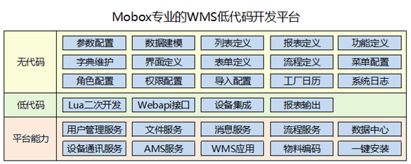 Mobox提供了WMS行業應用模板,系統預定義了WMS需求在實際業務環境中的成功應用和成果。這模型可以讓WMS開發或實施人員根據甲方實際需求進行快速開發及實施