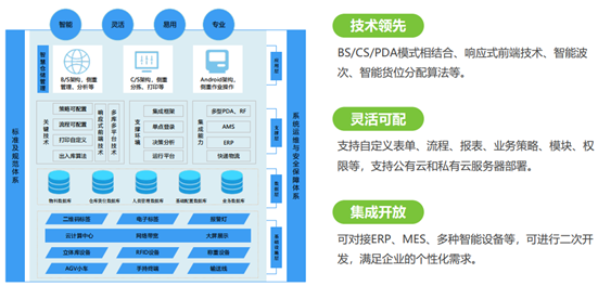 BS/CS/PDA模式相結合、響應式前端技術、智能波次、智能貨位分配算法等
