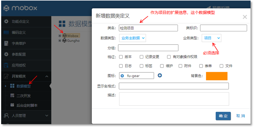 因為,我們是為Gungho的項目管理做配套,所以在mobox建立數(shù)據(jù)模型的時候,有類型需要選擇? ,業(yè)務類型必須是 “項目”