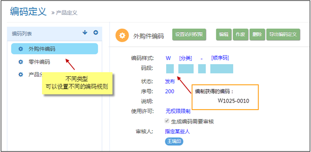 編碼定義即編碼規(guī)則定義,在該功能中可以定義某種編碼的組成規(guī)則,編碼由各種類型的碼段組成,碼段有長(zhǎng)度和顯示順序及相互之間的關(guān)系。在編碼定義中可以設(shè)置編碼由哪些碼段組成?確定碼段的順序、碼段的長(zhǎng)度、碼段之間的關(guān)系等信息,設(shè)置編碼的允許使用范圍,比如設(shè)置某一個(gè)編碼只允許某些人員、角色、部門能使用,也可以設(shè)置在申請(qǐng)編碼時(shí)是否需要有人審核,由誰(shuí)審核? 可以有效對(duì)編碼的使用進(jìn)行管理。