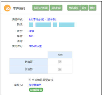 上圖所示,零件編碼只允許“銷售部”“開(kāi)發(fā)部”使用,申請(qǐng)編碼時(shí)需要由“綜合調(diào)度員”進(jìn)行審核