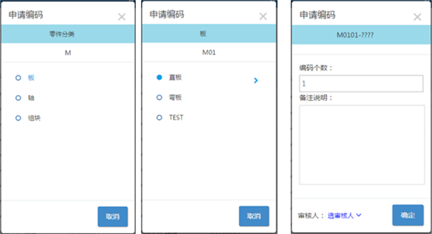 在上圖中最右邊一頁(yè)是當(dāng)所有的碼段都已經(jīng)設(shè)置完畢后出現(xiàn)的申請(qǐng)頁(yè)面,可以輸入申請(qǐng)的編碼的個(gè)數(shù)和原因,如果申請(qǐng)需要審核在這個(gè)頁(yè)面可以選擇審核人。