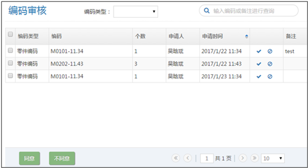 編碼審核就是對(duì)提交上來(lái)的編碼申請(qǐng)進(jìn)行判斷是否允許申請(qǐng)者使用的過(guò)程。一般是有企業(yè)的管理人員擔(dān)當(dāng)審核這樣的角色。該功能點(diǎn)沒(méi)有太多的概念,僅僅就是一個(gè)列表顯示所有需要操作這審核的編碼申請(qǐng),點(diǎn)中后進(jìn)行“同意”“不同意”操作,頁(yè)面如下圖所示。