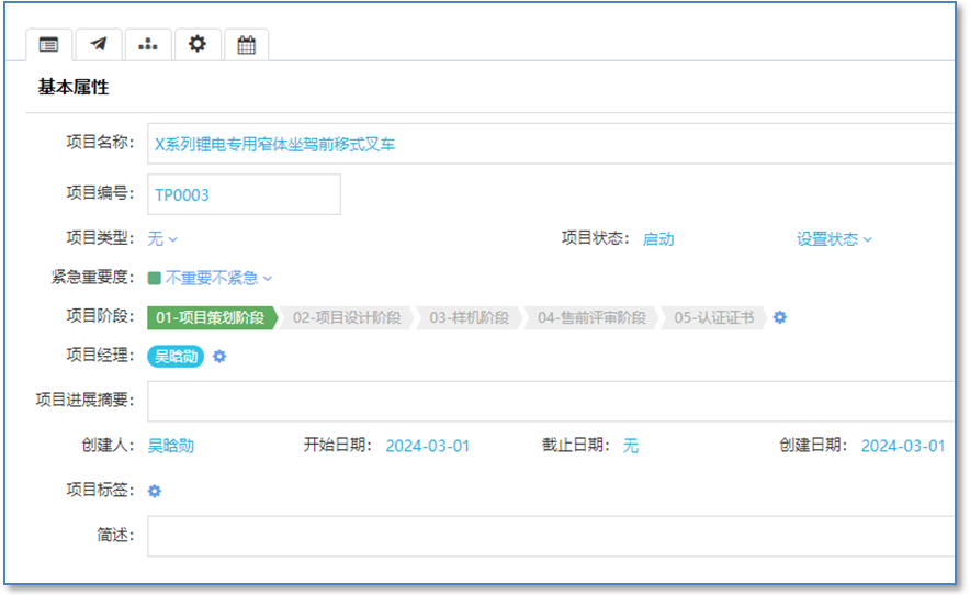 項目名稱、項目編號(可以自動生成)、項目經理、項目成員、開始日期、完成日期、項目描述、項目標簽等